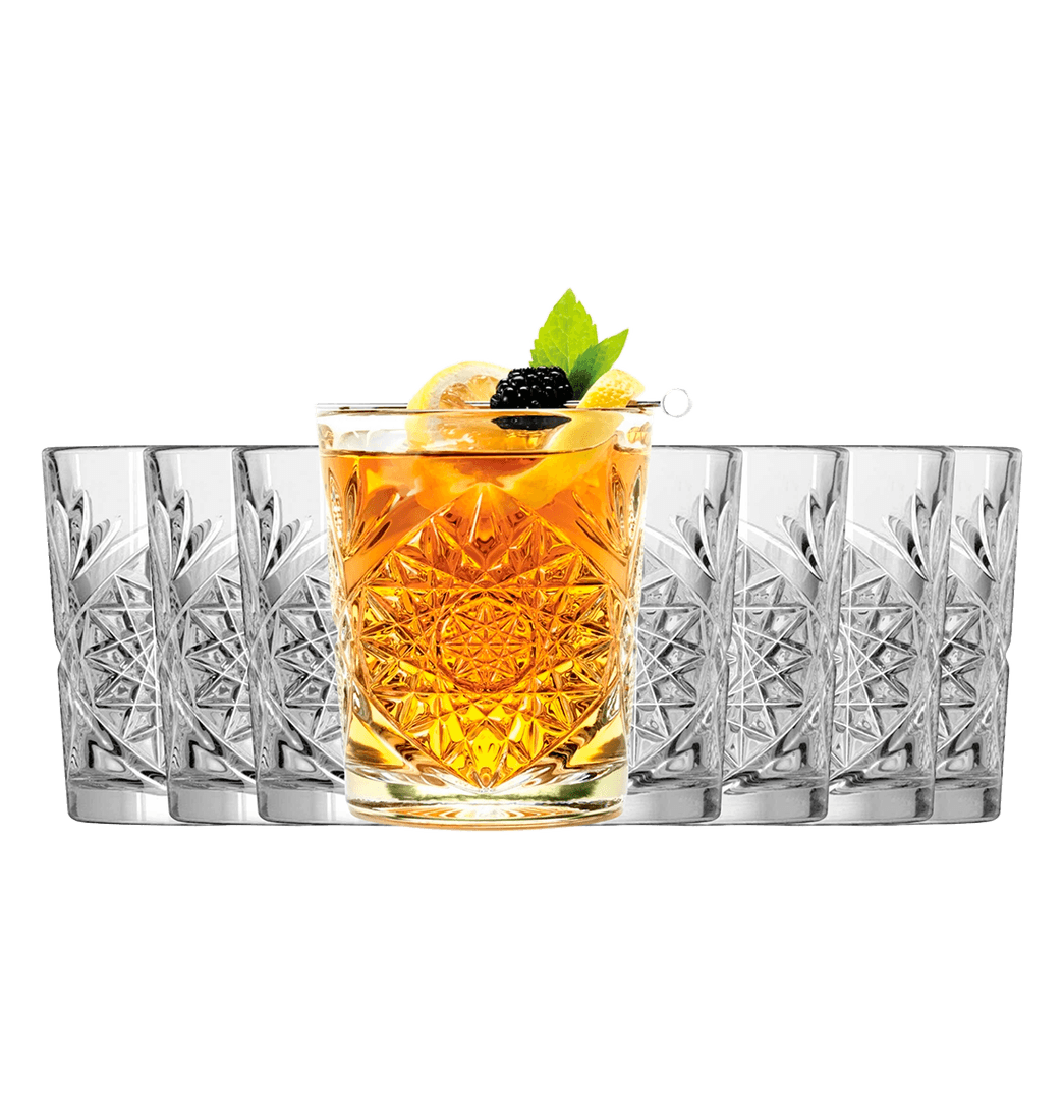 El diseño de la colección Hobstar se basa en los vasos tallados que Onis Libbey produjo entre 1876 y 1925, en el llamado "Período Brillante del Vidrio Tallado Americano", y encaja perfectamente con la tendencia actual del Vintage Chic. Los robustos vasos Hobstar añadirán un toque de atemporalidad vintage a las bebidas tanto tradicionales como modernas. ¡Disfruta de tus bebidas favoritas con estilo, y anímate a llevar este set de vasos ahora!.