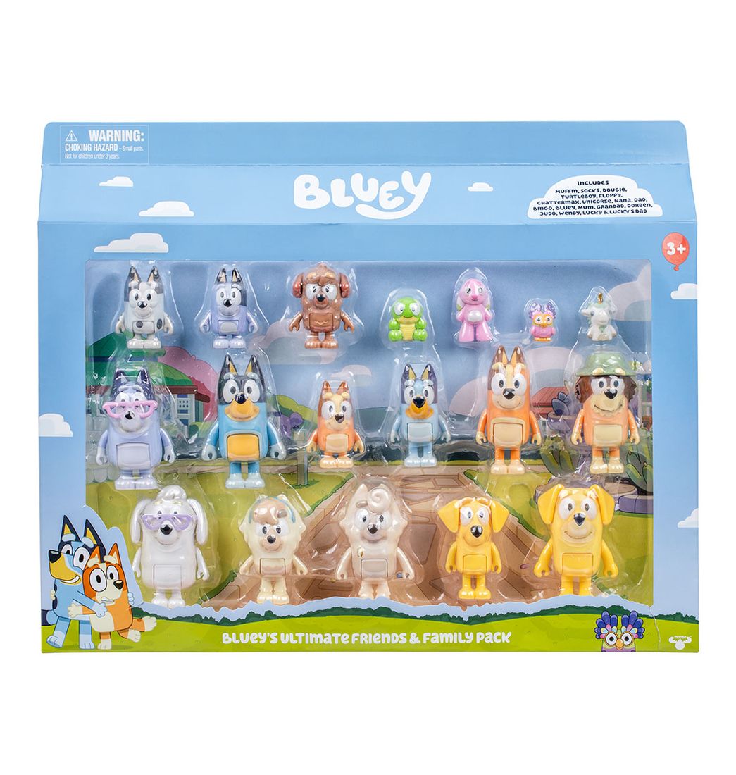 ¡Reúne a toda la familia, primos y vecinos de Bluey con este increíble set de 14 figuras! Este multipack incluye personajes clásicos y cuatro figuras exclusivas nuevas que no encontrarás en ningún otro lugar; porque la diversión en el vecindario con Bluey y sus amigos no tiene fin.