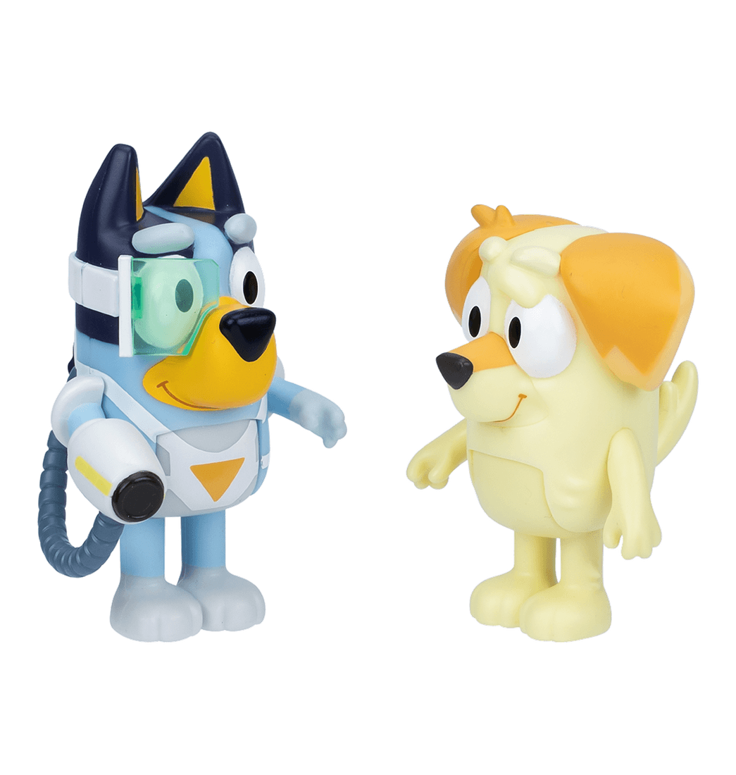 ¡Llegan los nuevos sets de figuras de Bluey! Cada set de 2 figuras está basado en un episodio de Bluey y viene con accesorios para aumentar la diversión. Hay dos nuevos paquetes para coleccionar: Fairytale y Surprise Blaster Suit. Las figuras de estos sets tienen brazos y cuerpos móviles y articulados.