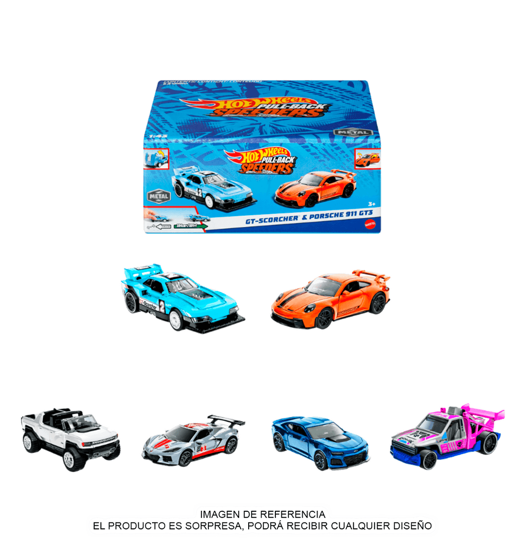 Incluye 2 vehículos Hot Wheels Pull-Back Speeders a escala 1:43.
