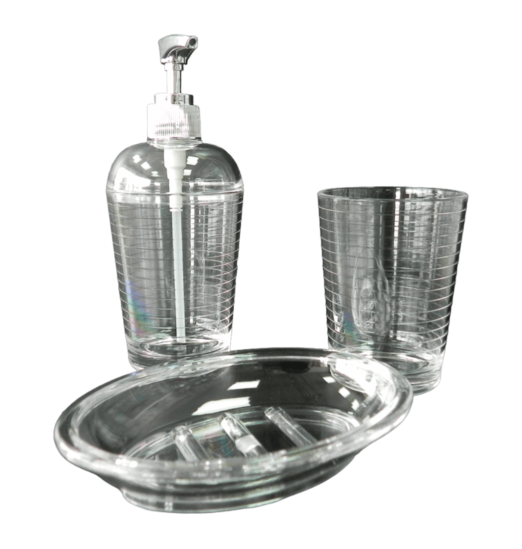 El Set para el baño que contiene dispensador de jabón líquido, jabonera y cepillero o vaso, trae diseño en acrílico transparente con suaves líneas horizontales. Es resistente a golpes, útil y práctico.