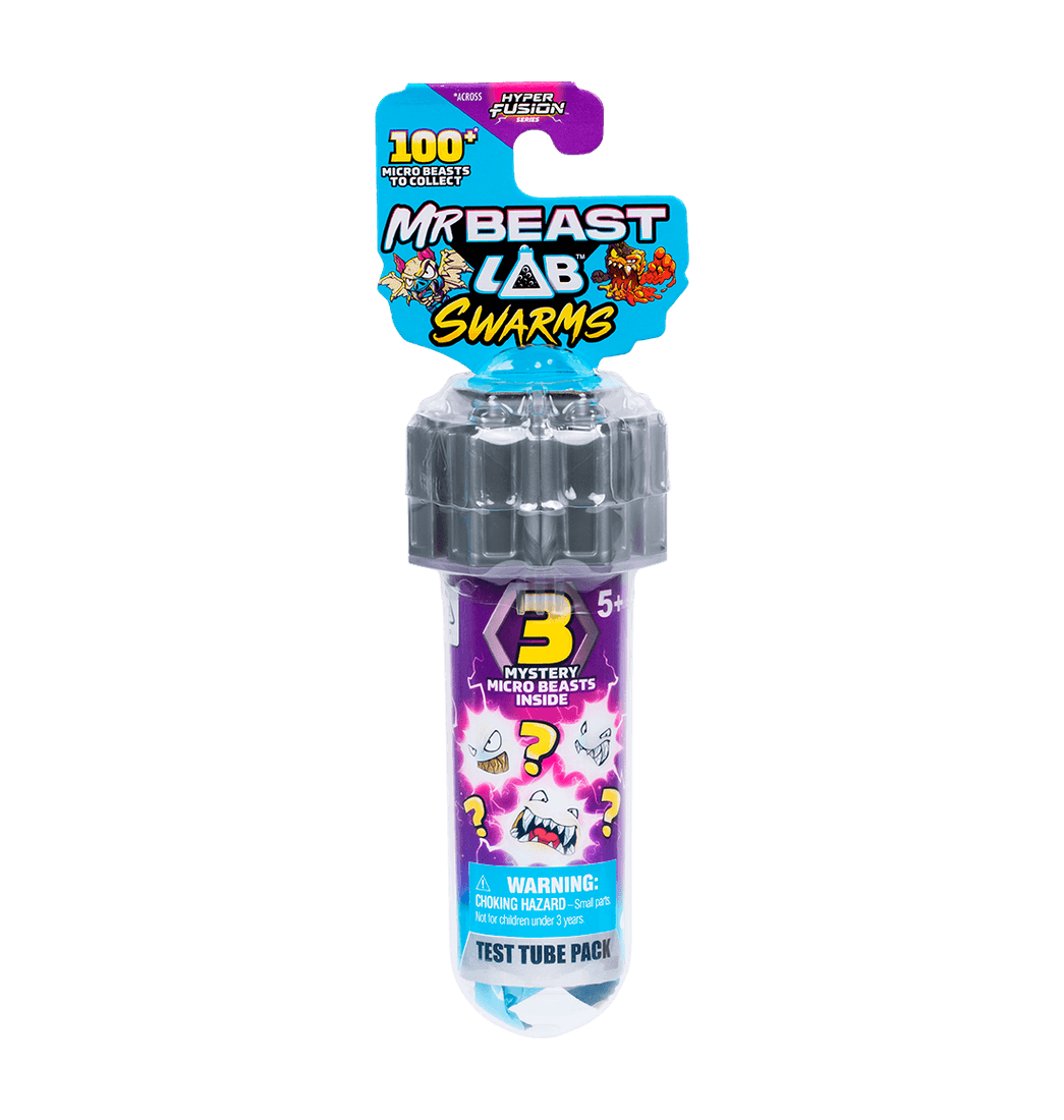 Cada tubo de colección incluye 3 Microbestias sorpresa, 3 pegatinas épicas de Hiperfusión y una tapa apilable que te permite unir varios tubos para crear tu propio laboratorio de MrBeast. ¡Entre más colecciones, más increíble será tu laboratorio!