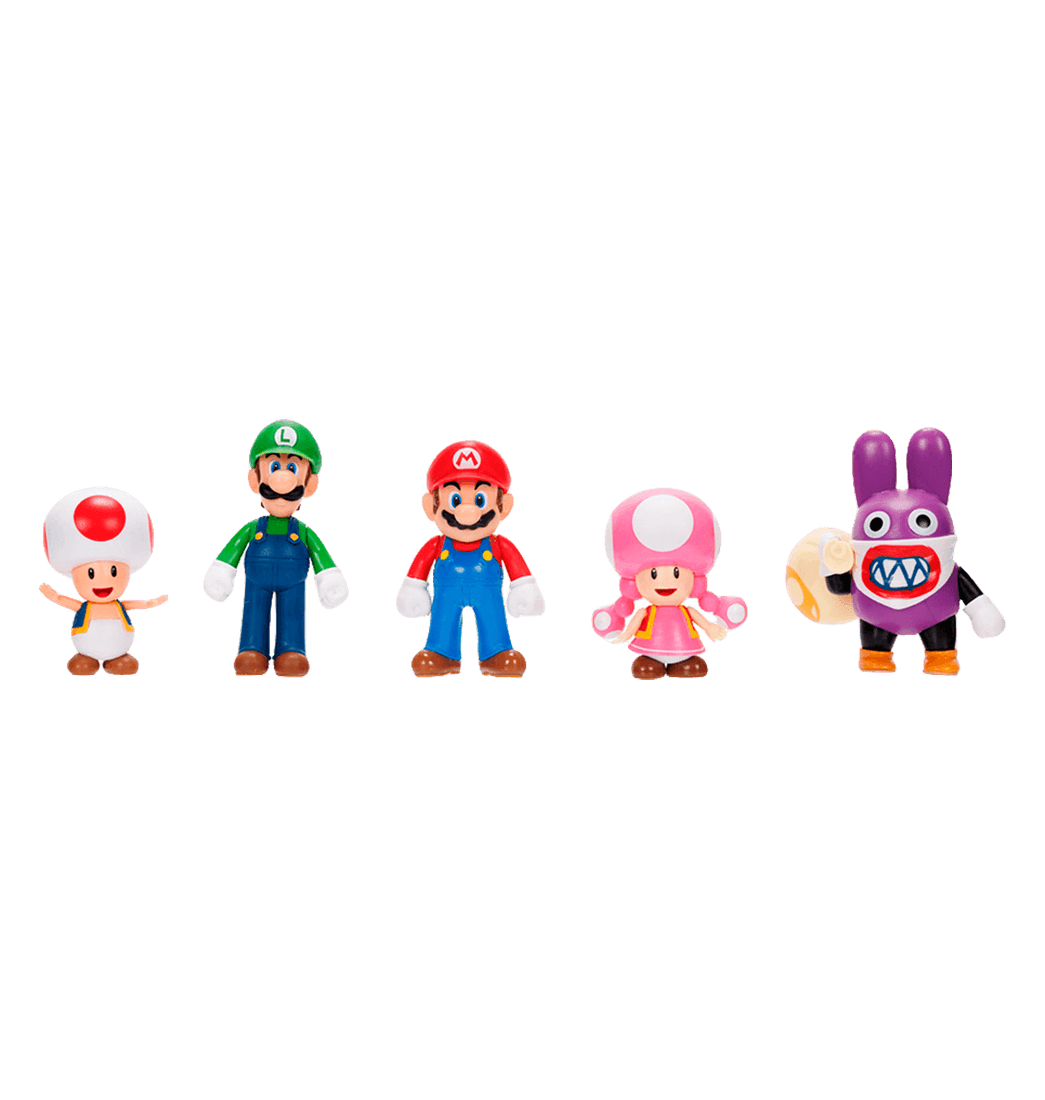 Recrea tus escenas favoritas con este multipack que contiene las figuras de Super Mario y sus amigos: Luigi, Nabbit, Toadette y Toad. Cada figura de juguete cuenta con detalles propios del personaje y son perfectas para exhibir en una colección.