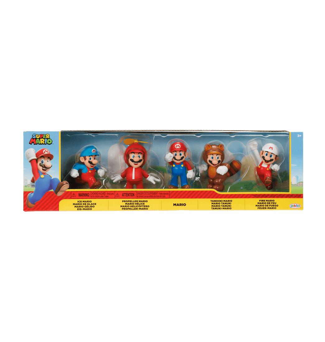 ¡Amplía tu colección de Super Mario con este set de cinco figuras de Mario! Este conjunto incluye muchas de las formas más reconocibles de Mario: Mario, Mario Tanooki, Mario de Hélice, Mario De Fuego y Mario De Hielo. Estas figuras auténticas tienen múltiples puntos de articulación y detalles extraordinarios. ¡Añádelo a tu colección hoy mismo!