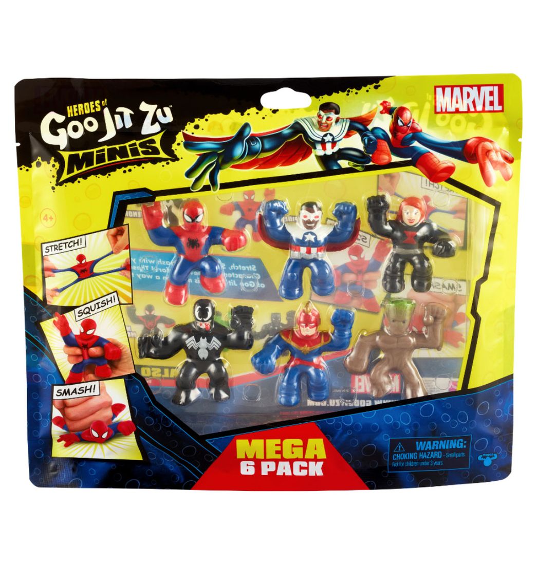 Los Héroes of Goo Jit Zu Marvel Minis regresan con personajes completamente renovados para estirar, aplastar y luchar. Este Mega paquete incluye 6 de los superhéroes más queridos de Marvel. Cada mini héroe de Marvel tiene la capacidad de estirar sus asombrosos cuerpos hasta 4 veces su tamaño real.