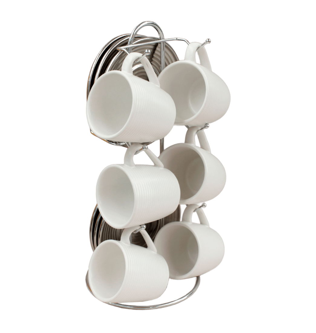 Set 6 Platos y Mugs con Soporte Metal, Blanco y Plata - Ikhome