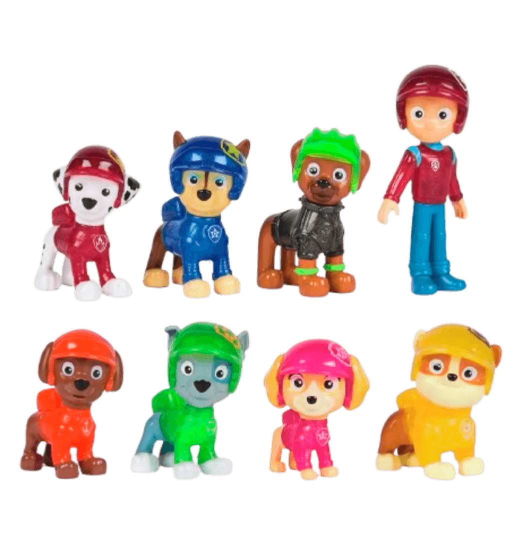 Incluye Ocho figuras coleccionables: Ryder, Chase, Boomer,Marshall, Skye, Rubble, Rocky y Zuma.