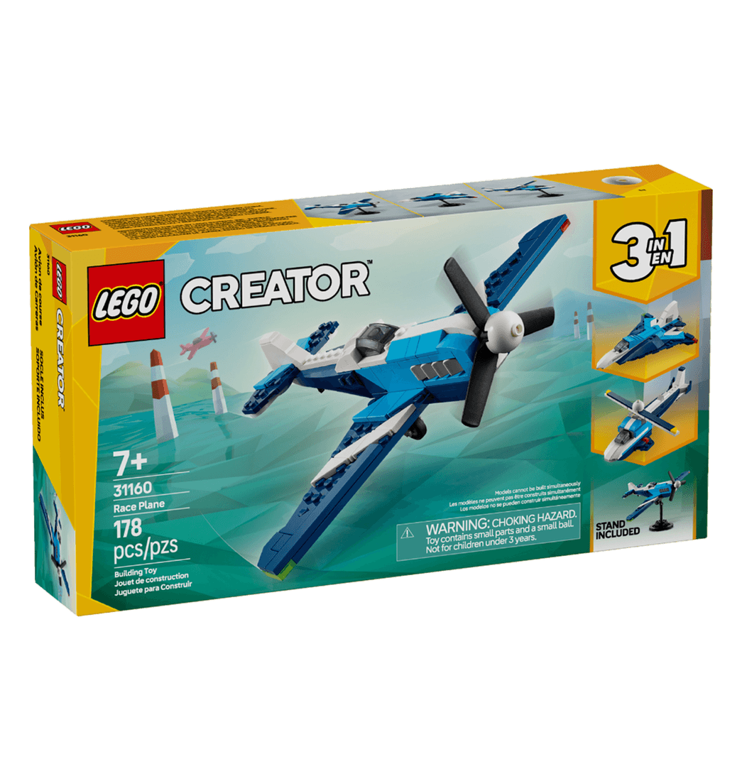 A niños y niñas les esperan trepidantes aventuras aéreas con el juego de juguetes LEGO Creator 3 en 1 Aeronave: Avión de Carreras. Este modelo de avión cuenta con hélice giratoria frontal, ruedas móviles para desplazarse por el suelo y una base de exposición construible.