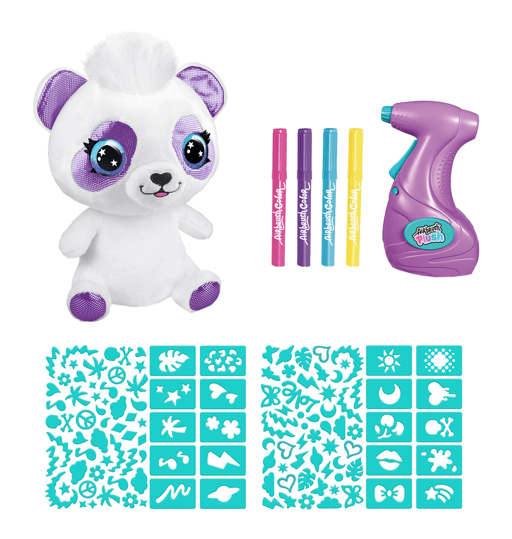 Incluye 1 peluche, 1 herramienta airbrush, 4 colores y plantillas reutilizables.