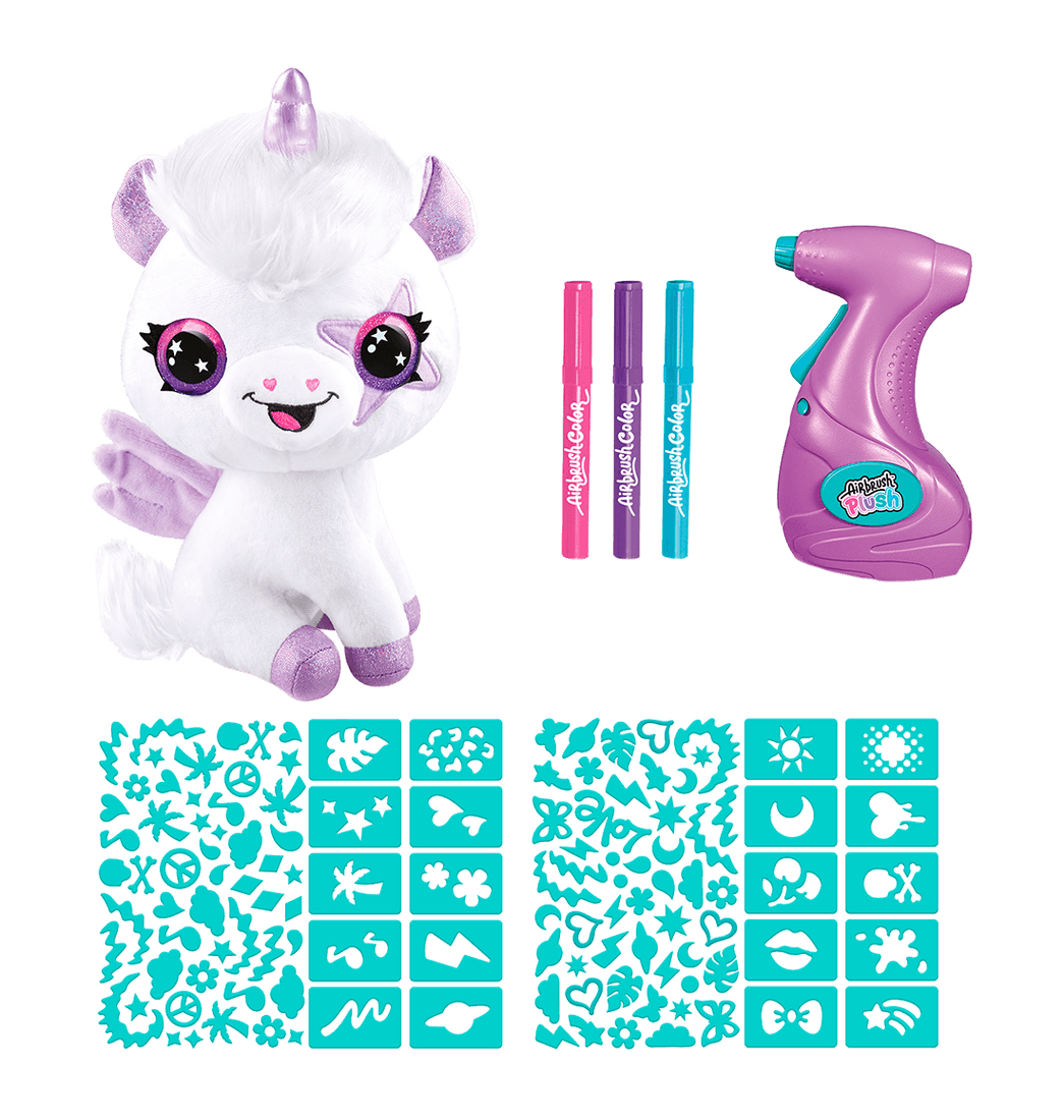 Incluye 1 peluche, 1 herramienta airbrush, 3 colores y plantillas reutilizables.