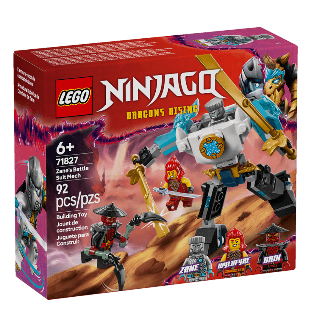 El juguete LEGO NINJAGO Armadura Robótica de Combate de Zane invita a los niños y las niñas a recrear la emocionante temporada 3 de la serie para televisión NINJAGO: El renacer de los dragones. Este set de construcción contiene un meca NINJAGO con brazos, piernas y manos articulados, parte superior del cuerpo que gira 360 grados, pecho que se abre para colocar una minifigura dentro y 2 grandes espadas.