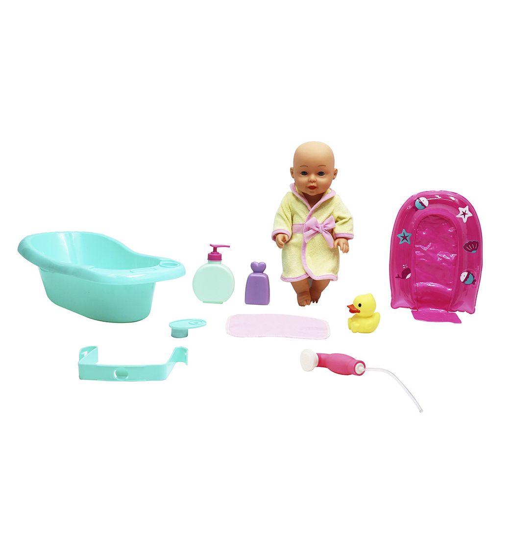 Incluye: 1 muñeca, 1 bañera, 1 colchón inflable, 1 patito de baño, 1 cabezal de ducha, 1 toalla, 1 bote de champú y 1 bote de loción.