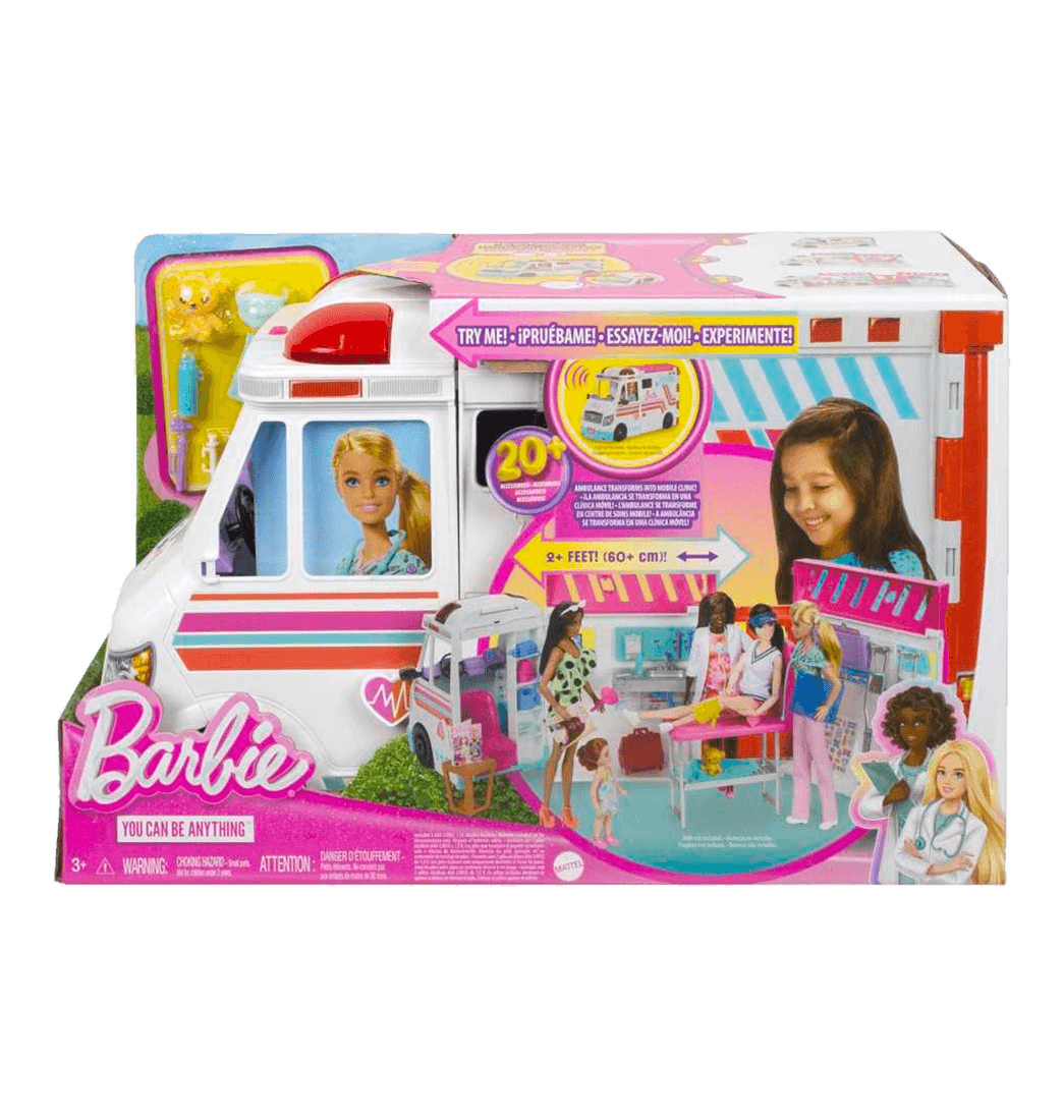 Explora el lado de la crianza como profesional médico con el set de juego de Barbie Care Clinic. El vehículo de atención médica se transforma de una ambulancia con luces y sonidos, a un consultorio medico con una sala de examen y una mesa de examen, un área de recepción y una sala de espera.