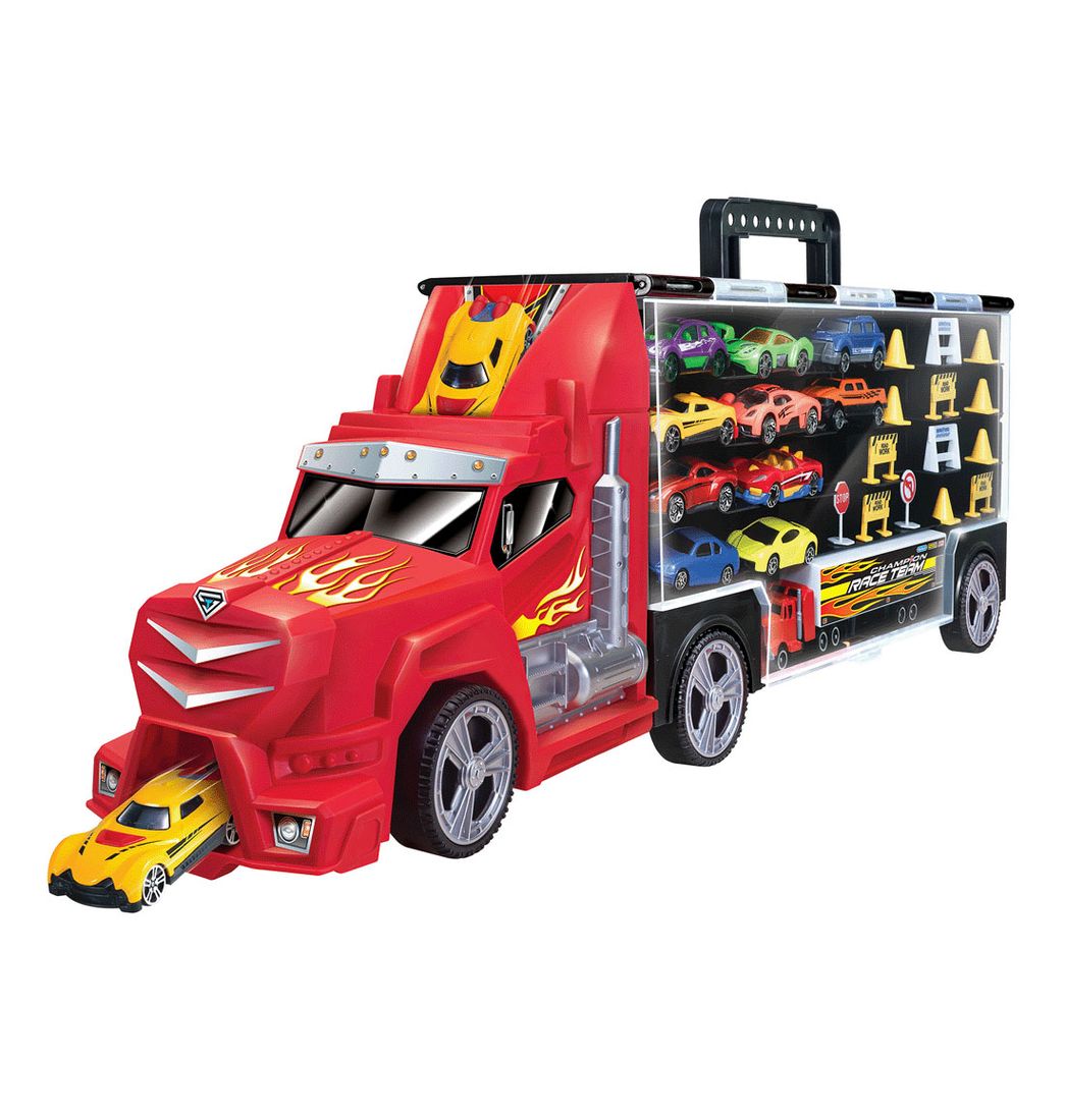 Este fabuloso camión de transporte manual incluye 10 vehículos de metal fundido, un camión de plataforma y varios accesorios de juego. La caja de carga del camión puede levantar 42 vehículos.