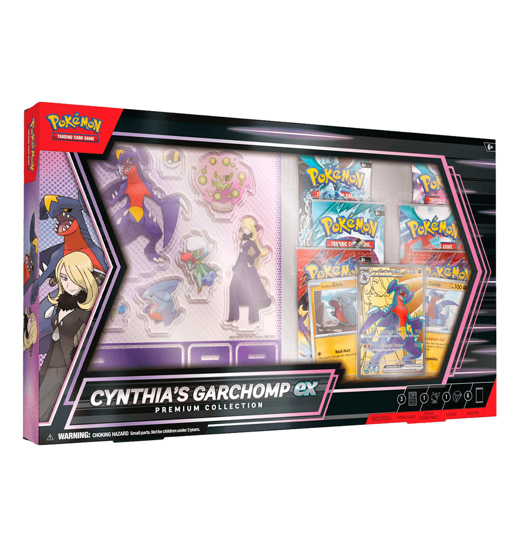 Incluye 1 carta holográfica promocional con arte completo del Garchomp ex de Cynthia, 2 cartas holográficas de Gible y Gabite de Cynthia, 1 lámina de figuras acrílicas de Cynthia, Garchomp y más, 1 expositor de doble cara, 1 pegatina con foto de Cynthia y Garchomp, 6 sobres de mejora de JCC Pokémon, 1 tarjeta con código para JCC Pokémon Live.