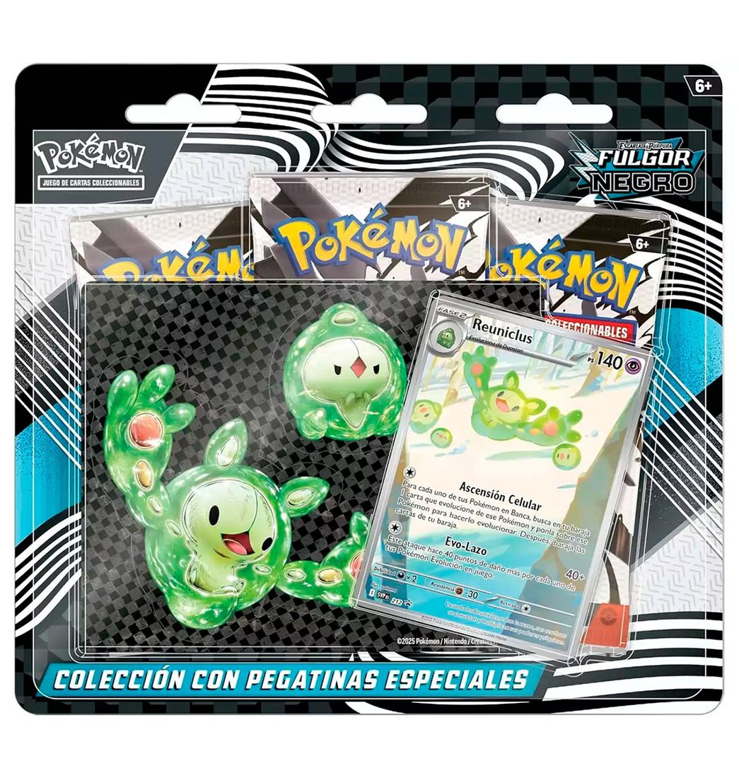 Incluye: 1 carta holográfica promocional de Reuniclus, 1 hoja de pegatinas tecnológicas, 3 paquetes de mejora de Escarlata y Violeta-Rayo Negro de JCC Pokémon y 1 tarjeta con código para JCC Pokémon Live.