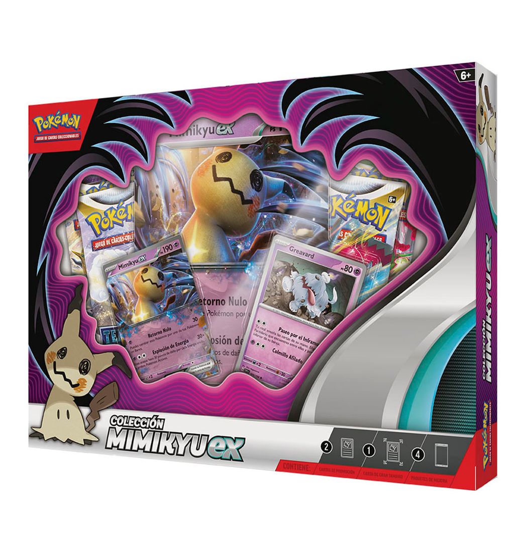 Incluye La colección Mimikyu ex de JCC Pokémon contiene: 1 carta holográfica de promoción de Mimikyu ex, 1 carta holográfica de Greavard, 1 carta holográfica de gran tamaño de Mimikyu ex, 4 paquetes de mejora de JCC Pokémon y 1 carta con código para JCC Pokémon Live.