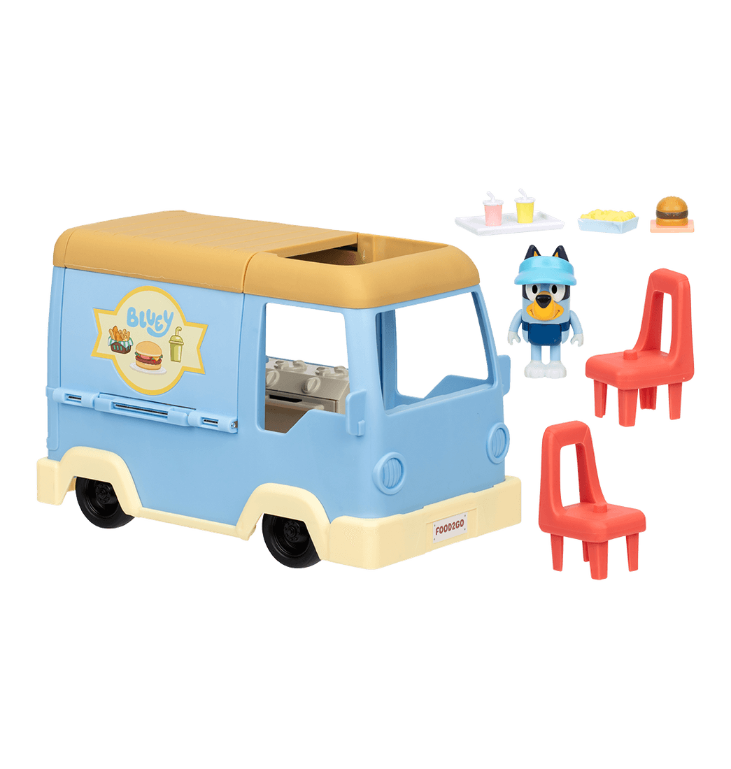 ¡Prepárate para una aventura deliciosa con el camión de comidas de Bluey! Se transforma en una estación de servicio con figuras, mesas y accesorios para jugar al chef. ¡Cocina, comparte y diviértete sin parar con Bluey y sus amigos!