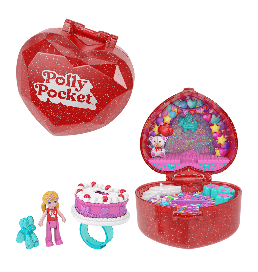 ¡Polly Pocket está lista para celebrar el 80° Aniversario de Mattel! Este Compacto Mattel 80th Caja de Anillo Rubí tiene forma de corazón y un acabado con brillantina transparente. Abre el compacto para unirte a Polly y su mascota de globo en la celebración.