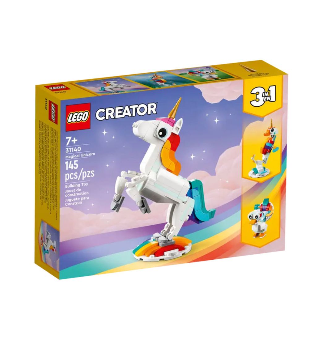 Los niños imaginativos se transportarán a una tierra mítica llena de fascinante acción con el set de construcción 3en1 Unicornio Mágico (31140). Contiene un unicornio de juguete con cuerno dorado, vistosa cola, y patas y pezuñas articuladas. Puedes colocarlo en 2 posturas: sobre las 4 patas o sosteniéndose sobre las 2 traseras en una inconfundible pose, expuesto en la base arcoíris del set.