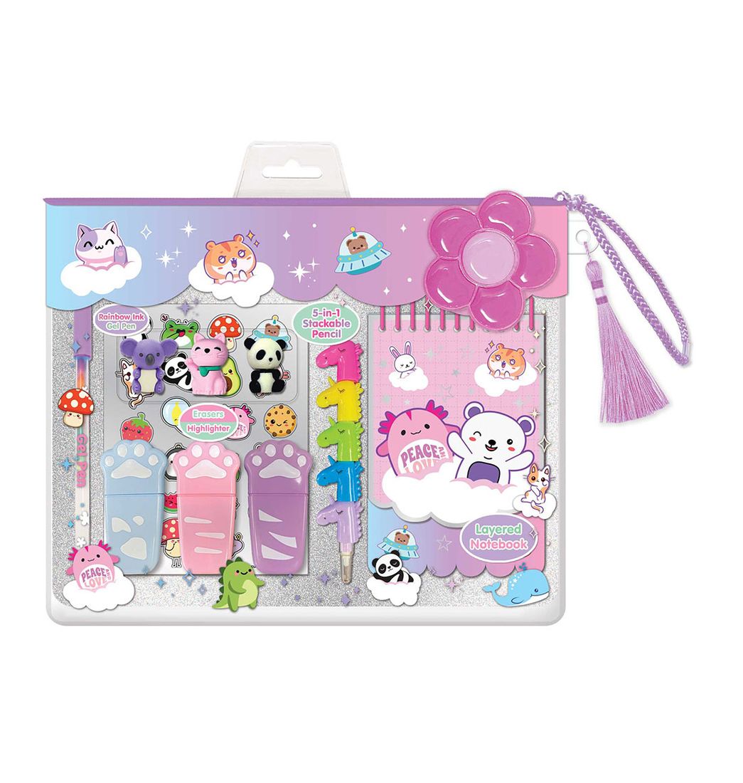 Incluye: 1 Bolsa de PVC reutilizable con asa; 1 Cuaderno de capas; 3 Marcadores de colores; 3 Borradores de rompecabezas; 1-5 lápices apilables; 1 Bolígrafo de gel arcoíris; 1 Hoja de pegatinas.