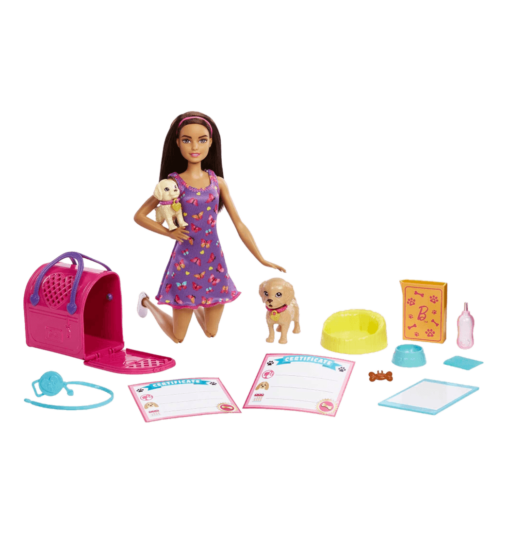 La muñeca Barbie adopta perritos con el set de juego Pup Adoption. Los accesorios Barbie de este set, permiten que las niñas amantes de los animalitos se conviertan en nuevas dueñas de perros y que cuiden, críen y entrenen a dos adorables perritos.