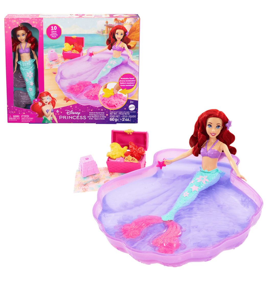 Incluye 1 muñeca Ariel, 1 alberca, arena moldeable y 9 accesorios.