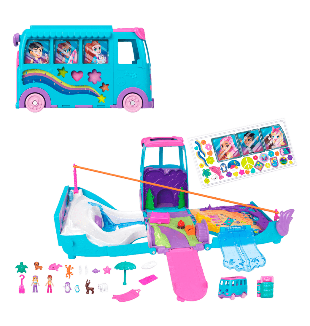 ¡Únete a Polly Pocket y sus amigos en un emocionante viaje con el set de juego Aventura Sobre Ruedas con Mascotas. Los niños pueden decorar el exterior de la camioneta con temática de mascotas usando estampas para después abrirla para descubrir un set de juego más grande con nueve funciones divertidas, como un telesquí y olas para surfear.
