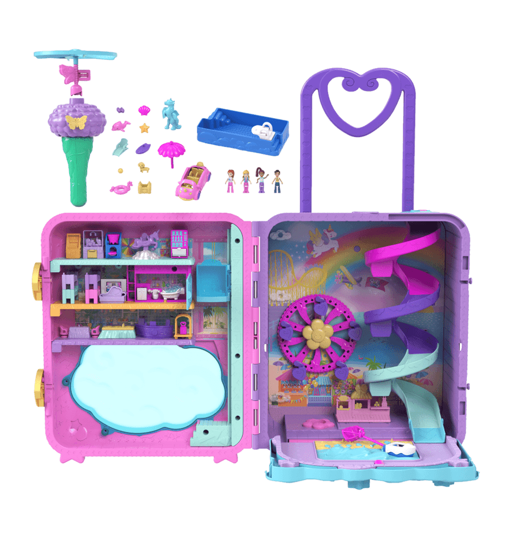 Viaja con Polly Pocket y una maleta de viaje con mucho estilo. Pollyville Resort Roll Away es un set de juego y un excelente lugar para guardar los compactos Polly. El set cuenta con un asa que se extiende, perfecto para llevar el resort a todas partes.