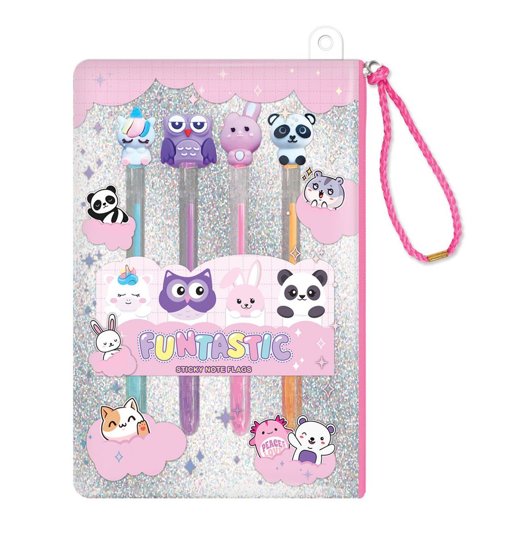 Incluye: 1 bolsa reutilizable; 4 bolígrafos de gel perfumados con adorables adornos 3D; 4 blocs de notas adhesivas; 1 hoja de pegatinas.