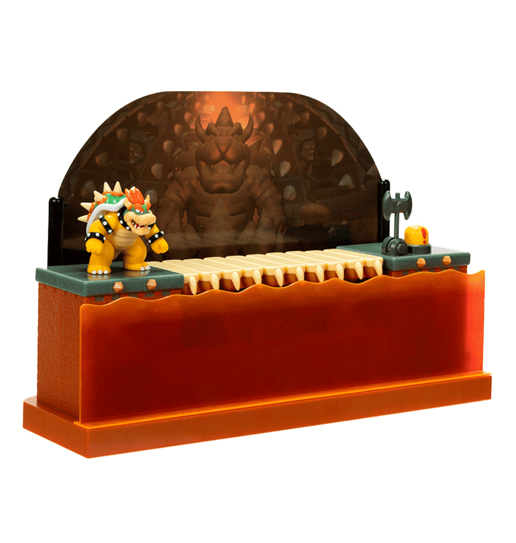 Este fabuloso Set Batalla de Bowser cuenta con una escena de puente reconocible con fondo y detalles específicos del nivel. La lava brillante, los efectos de sonido y la música dan vida a la experiencia. Derrota a Bowser presionando el botón amarillo y míralo caer mientras el puente se derrumba de derecha a izquierda.