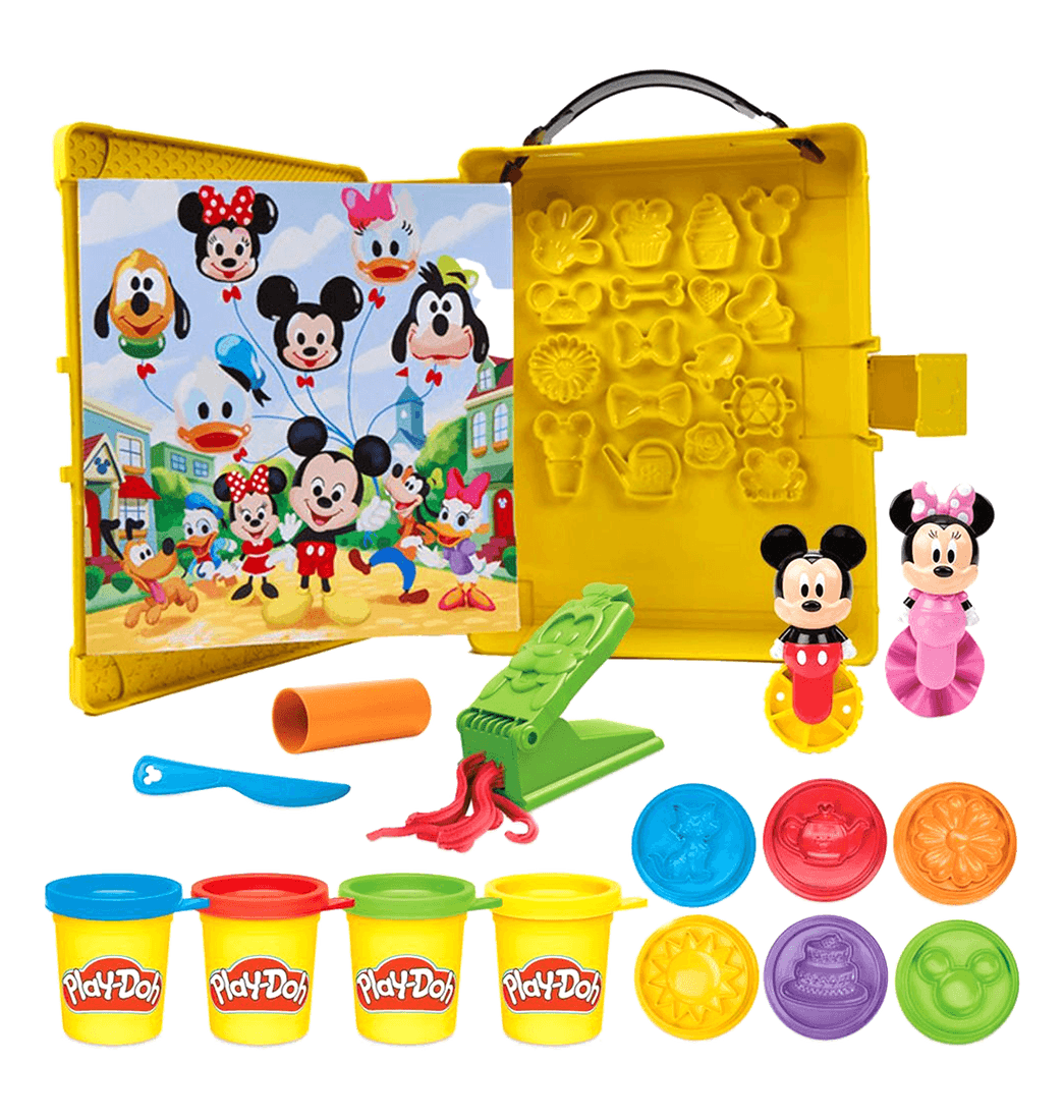Incluye mantel con forma de libro de cuentos, rueda con sellos de Mickey, rueda cortadora de Minnie, Fábrica de Diversión de Goofy, 6 sellos, rodillo, cuchillo y 4 botes de plastilina Play-Doh (total: 227 gramos).