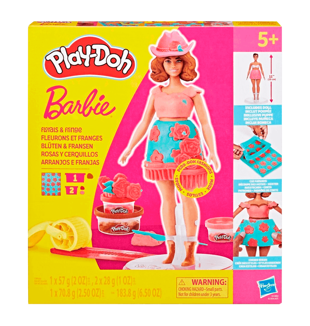 ¡Crea geniales estilos con el set Play-Doh de Barbie! Con este set de manualidades, es muy fácil y divertido crear ropa de muñecas Barbie con masa para moldear Play-Doh. Solo coloca la muñeca en la base, usa la hoja de patrones y los cortadores Play-Doh para cortar vestidos para Barbie, y vístela de las maneras más creativas posibles.