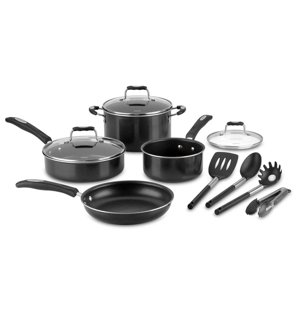 Incluye: Cacerola de 1.5 qt con tapa, cacerola de 2.5 qt con tapa, sartén sauté / sartén profunda de 3 qt con tapa, olla tipo stock pot de 6 qt con tapa, sartén de 8? (20,3 cm), sartén de 10? (25,4 cm) y utensilios: volteador ranurado, cuchara, cuchara para pasta y tenazas (pinzas de nylon).