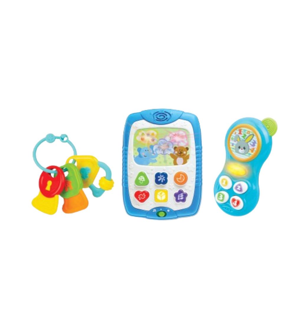 Incluye Tablet interactiva, teléfono con sonidos divertidos y un juego de llaves con texturas variadas.