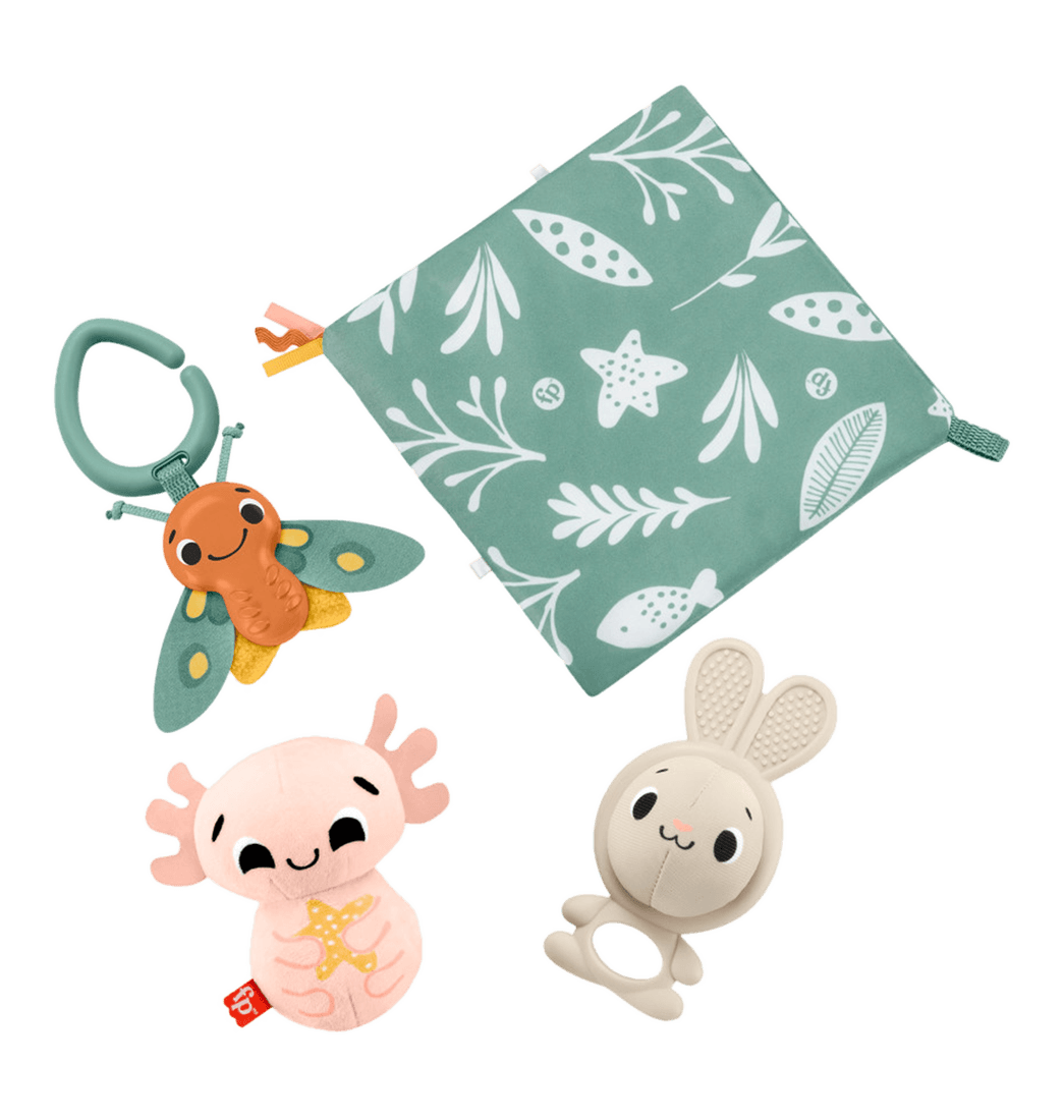 A los recién nacidos les encantará la diversión sensorial del set de regalo Muchos Sentidos de Fisher Price. Este set de 4 juguetes sensoriales para bebés incluye una mordedera de conejo sin BPA con una pelota musical desplegable, un axolotl suave con campanilla, una sonaja de polilla texturizada y un panel con textura suave con una etiqueta de listón.