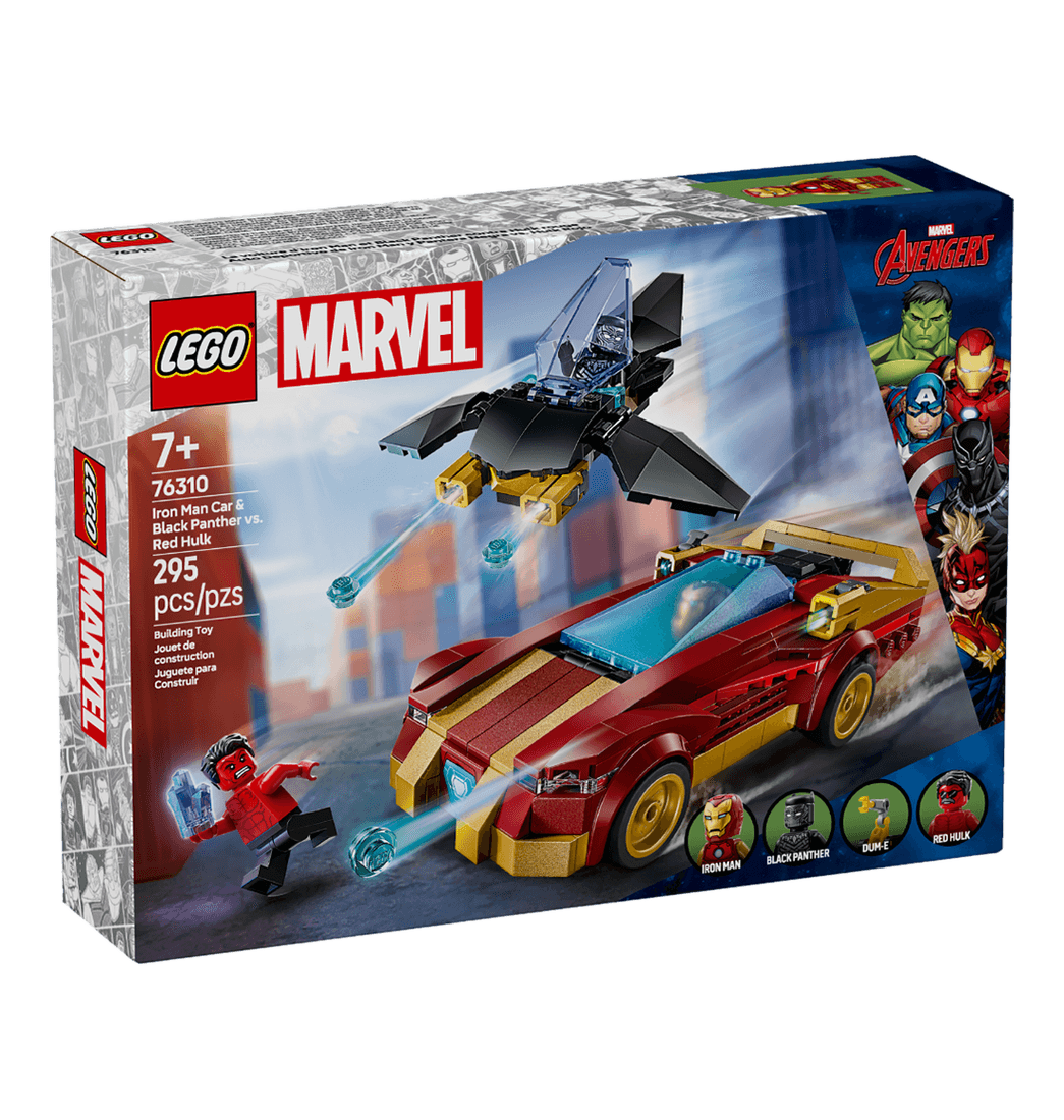 Cuenta con minifiguras de Iron Man, Black Panther y Hulk Rojo, así como una figura LEGO de Dum-E, el ayudante robótico de Iron Man, con su extintor de incendios. El deportivo de Iron Man tiene 2 cañones que disparan, habitáculo abatible y espacio para Dum-E y su extintor. La aeronave de Black Panther tiene 2 cañones que disparan, alas ajustables, cabina abatible y panel de control.