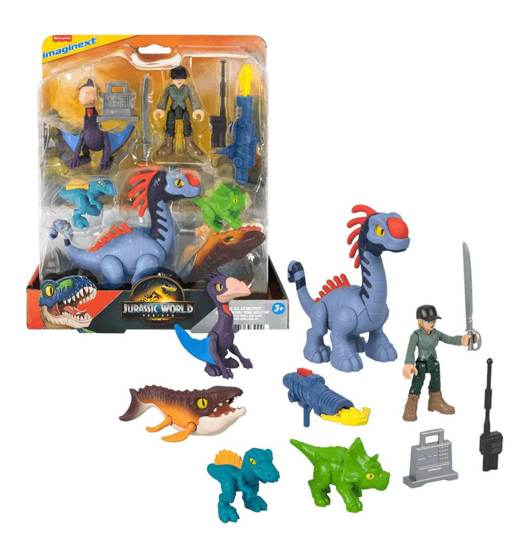 Los pequeños fans de Jurassic World dejarán volar su imaginación por tierra, mar y aire con este multipack Imaginext inspirado en la película. El set incluye una figura, cinco dinosaurios, un lanzador con proyectil y tres accesorios temáticos de rastreo.