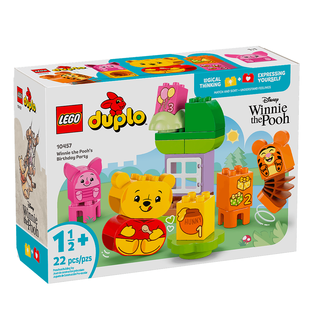 Los bebés comparten momentos llenos de juego creativo con sus papás y aprenden jugando con el set de construcción LEGO DUPLO Disney Fiesta de Cumpleaños de Winnie the Pooh (10457). Este juguete educativo ayuda a los bebés a partir de 18 meses a trabajar las habilidades tempranas mientras practican el juego imaginativo.
