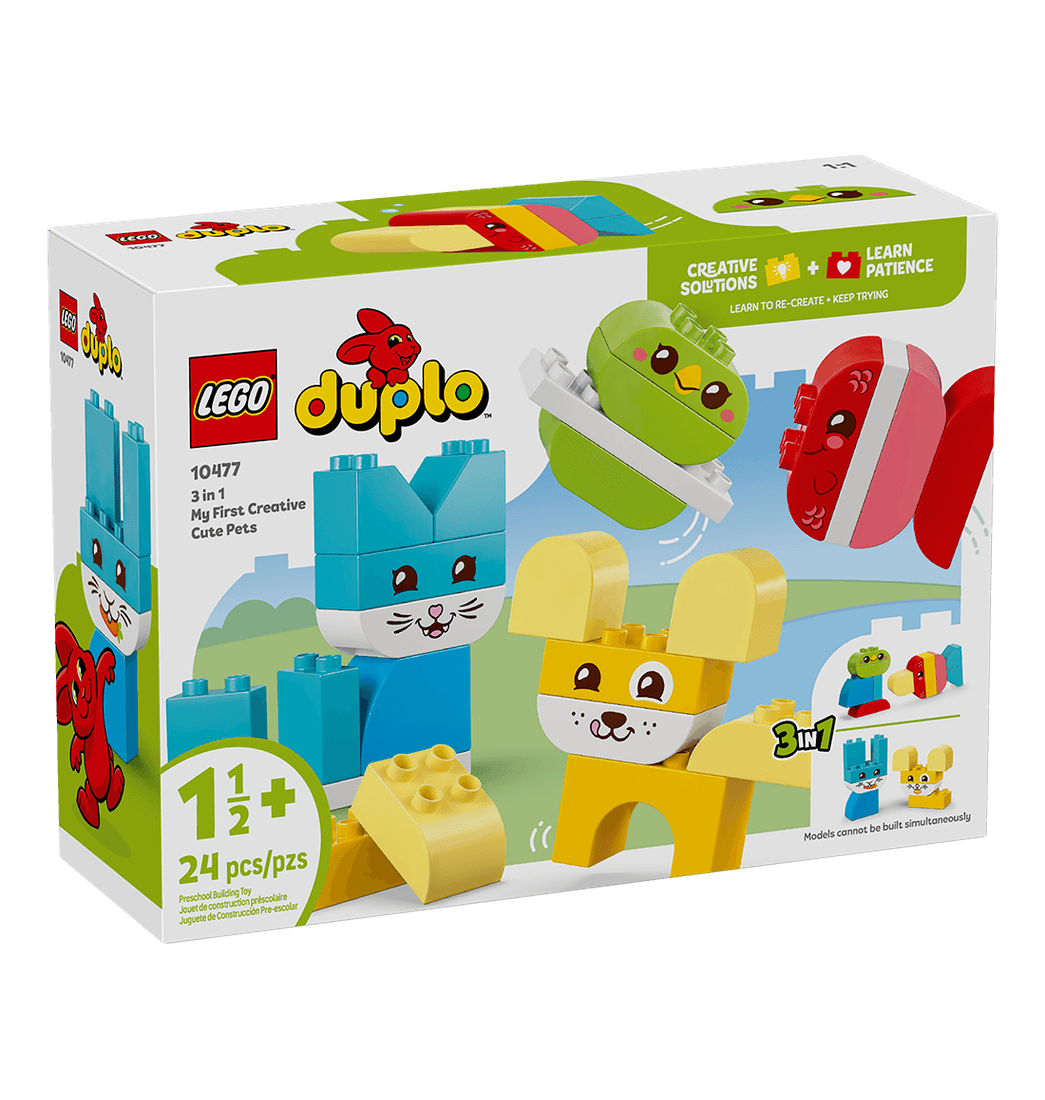 ¡Llena de color y creatividad el tiempo de juego con el juguete Mi Primer LEGO DUPLO Simpáticas Mascotas Creativas “3 en 1” (10477)! Este set para bebés a partir de 18 meses ofrece 8 opciones de construcción diferentes con los mismos ladrillos.