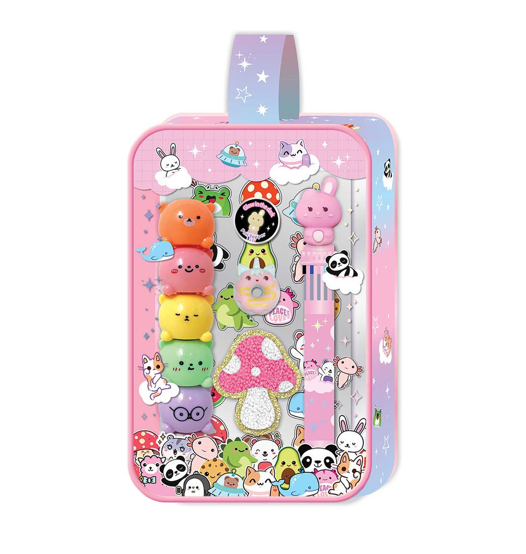 Incluye: 1 bolsa reutilizable; 1 bolígrafo de 10 colores con tapa; 1 resaltador apilable 5 en 1; 1 borrador de rompecabezas; 1 parche decorativo; 1 hoja de pegatinas.