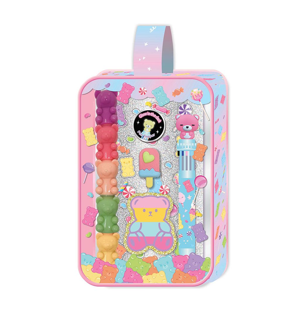 Incluye: 1 bolsa reutilizable; 1 bolígrafo de 10 colores con tapa; 1 resaltador apilable 5 en 1; 1 borrador de rompecabezas; 1 parche decorativo; 1 hoja de pegatinas.