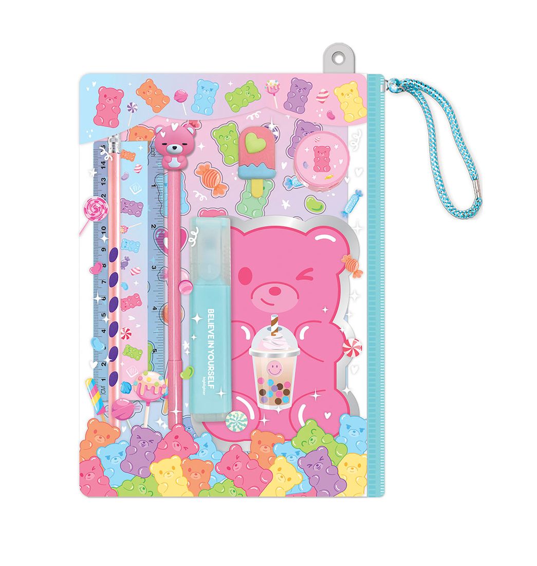 ¿Quién dice que la escuela tiene que ser aburrida?! Este fabuloso Set de estudio tiene los artículos escolares más modernos y adorables, que se pueden guardar en la bolsa reutilizable.