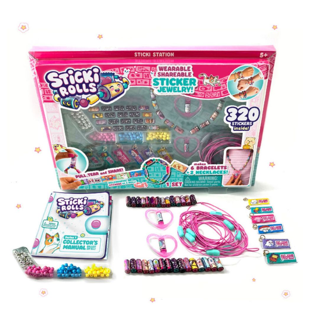 Incluye 320 calcomanías (32 rollos Sticki), 144 cuentas, 8 cordones elásticos con cierres, 6 etiquetas de dije, 2 colgantes de collar Sticki, 1 manual de coleccionista, 1 cordón adicional.