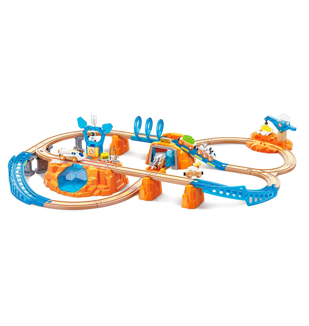 Incluye: 19 vías de madera, 1 grúa, 5 vagones de transporte, 2 bloques de carga, 1 base marciana, 1 radar, 1 antena, 1 montaña, 1 vía S de plástico, 1 vía corta de plástico, 2 vías grandes ascendentes de plástico, 4 puentes, 3 puentes de montaña, 3 cubiertas en espiral, 2 figuras espaciales, 1 papel luminoso.