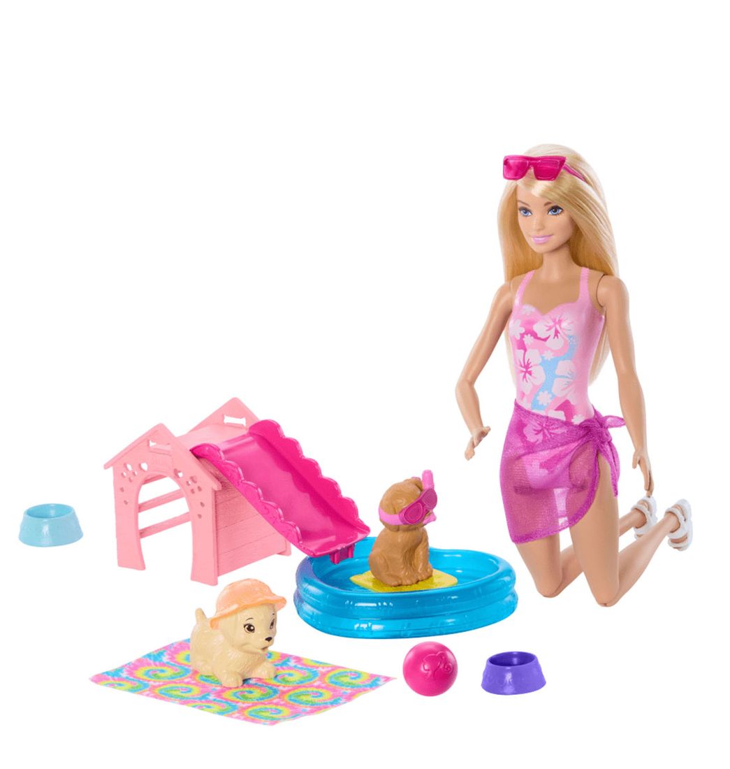 ¡Date un chapuzón de alegría con el set de juego Barbie Fiesta en la Piscina con Perritos! Desliza a los cachorros por el tobogán de su casa para perros, que los lleva directo a la alberca con forma de corazón. Con un pequeño apretón el perro blandito lanzará un chorro de agua.