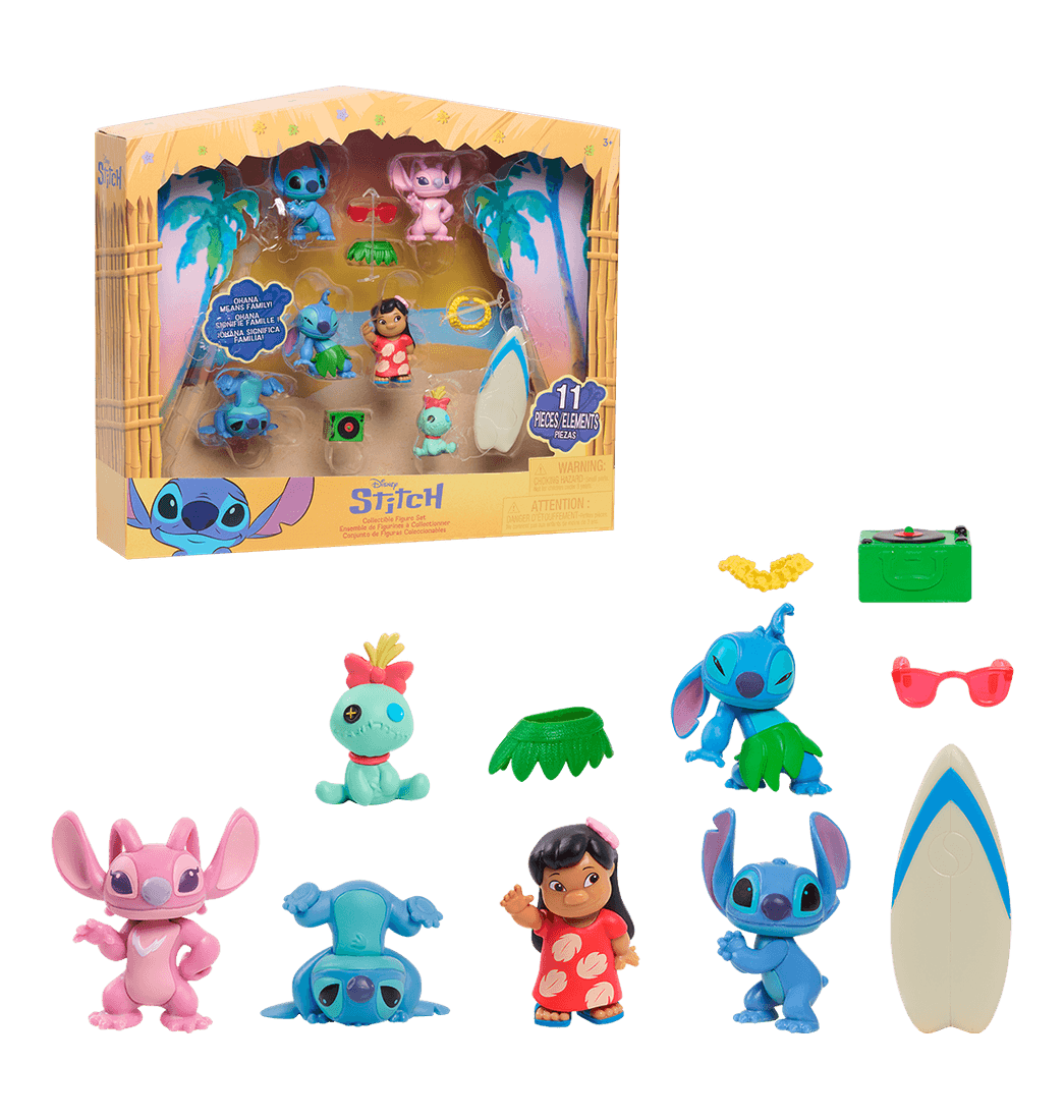 El set incluye figuras de Stitch en 3 poses diferentes, Angel, Lilo y Scrump, además de una tabla de surf, un lei, unas gafas de sol, una falda de hula y un tocadiscos..