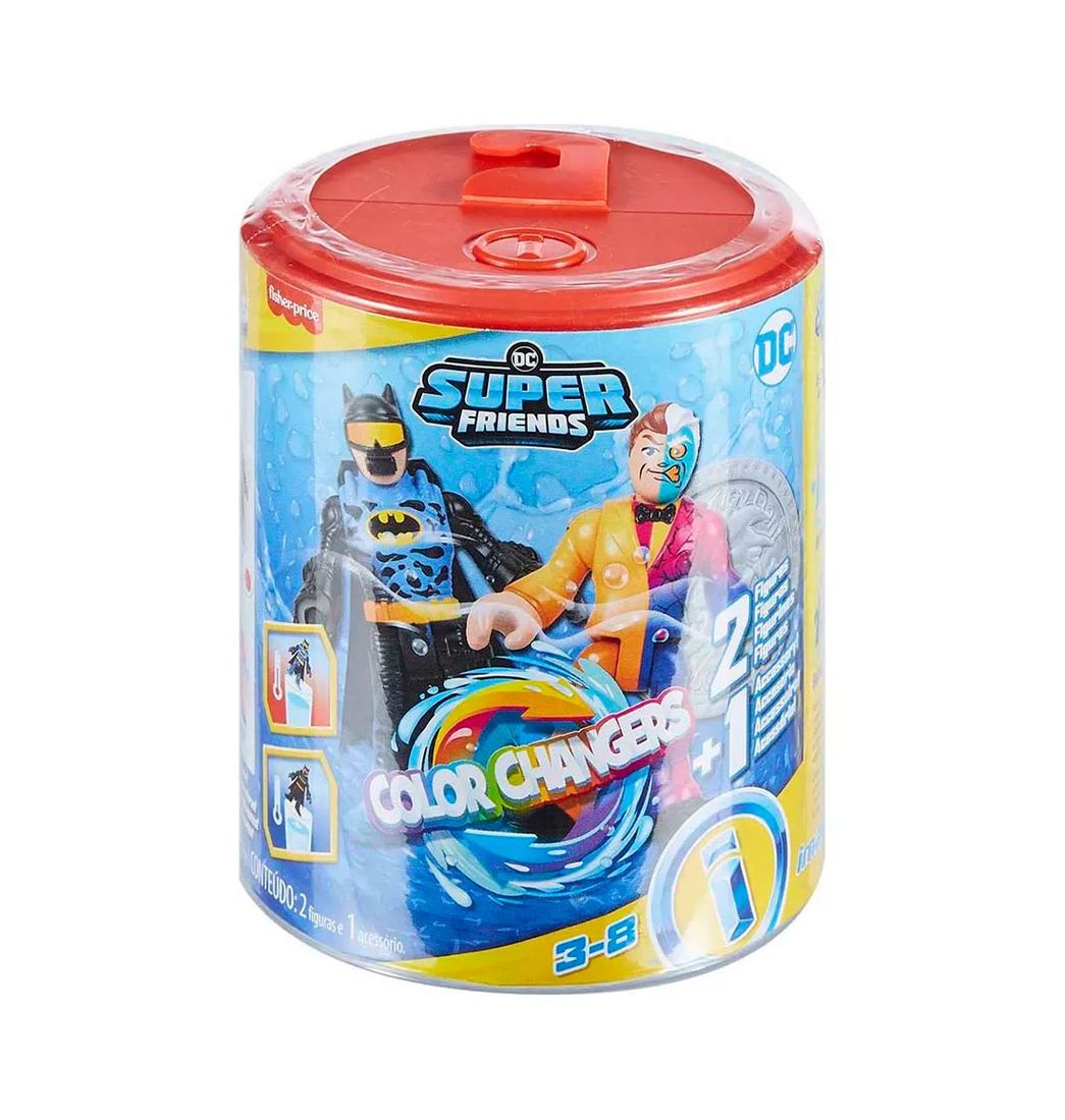 Incluye 2 mini figuras articuladas, 1 pieza de juego y un recipiente para mojar, almacenar o exhibir. Los niños pueden sumergir cada figura en agua tibia o helada para revelar decoraciones de diferentes colores. ¡Los niños pueden coleccionar los sets de figuras adicionales de Imaginext DC Super Friends Color Changers para juegos de simulación más emocionantes!