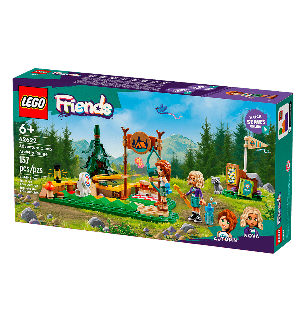El juguete de construcción LEGO Friends Campamento de Aventura: Área de Tiro con Arco incluye minipersonajes de Autumn y Nova, un mapache y equipo deportivo. Las niñas y los niños pueden realizar prácticas de tiro de verdad con el arco de este emocionante set, que dispara las flechas y todo.