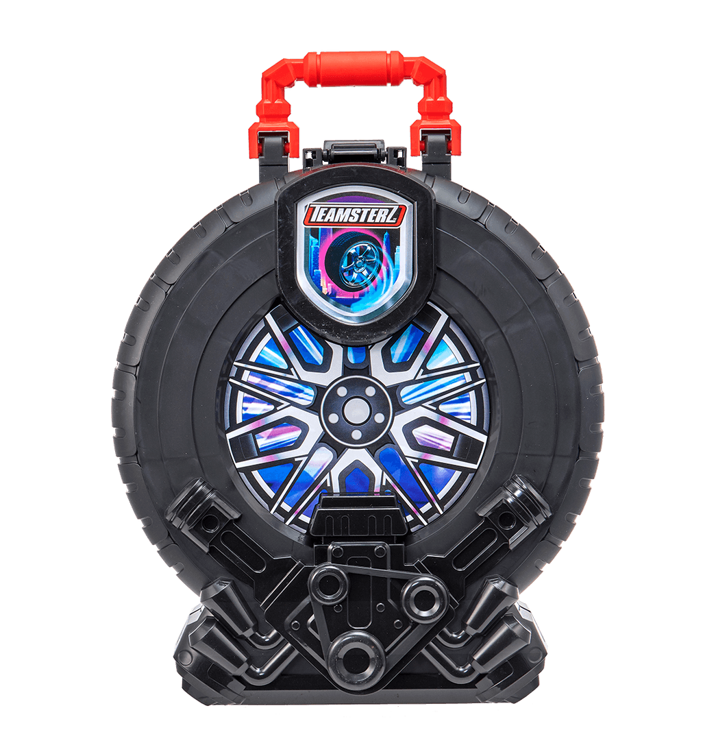 Es un práctico garaje portátil con forma de rueda gigante que se abre para revelar varios niveles de estacionamiento y pistas de acceso. Incluye un vehículo die-cast y cuenta con asa para transportarlo fácilmente a cualquier lugar. Su diseño plegable permite mantener todo organizado y listo para la acción en cuestión de segundos.